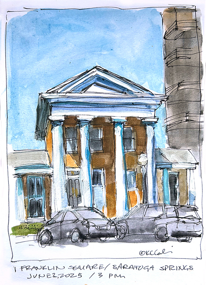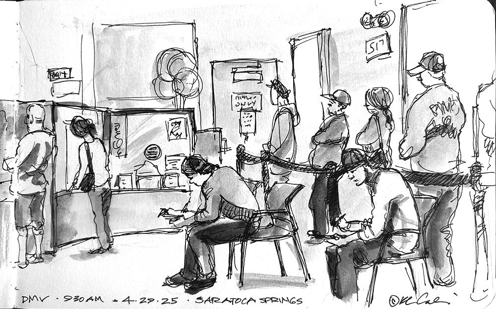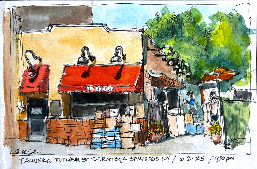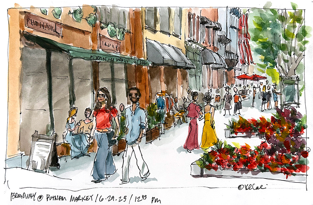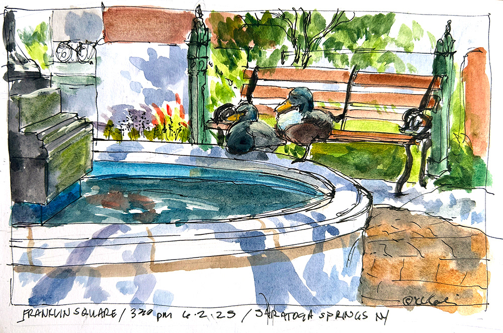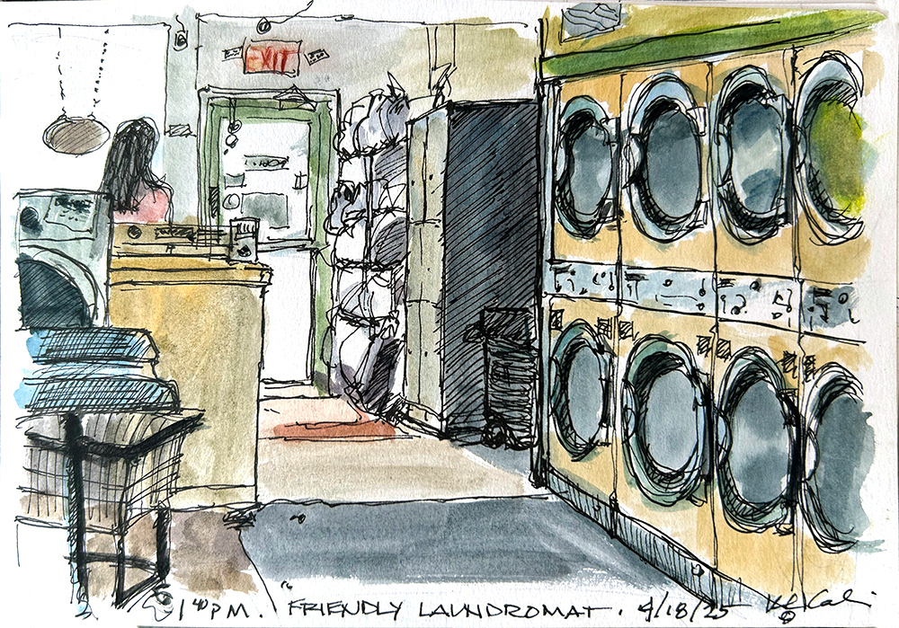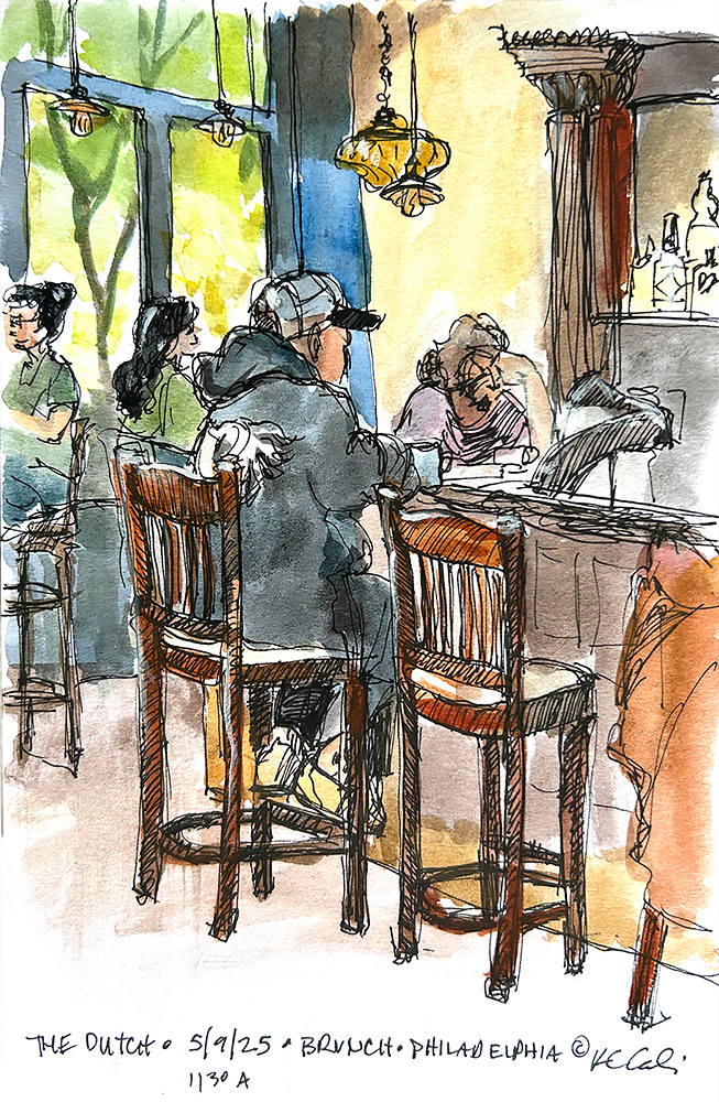 I sketch pretty much wherever I am and I also go out (usually walking) to find a place to sketch. Everything is done in an 8.5" x 5.5" Canson Graduate multimedia sketchbook with a Pentel Finito pen and a small box of watercolors.