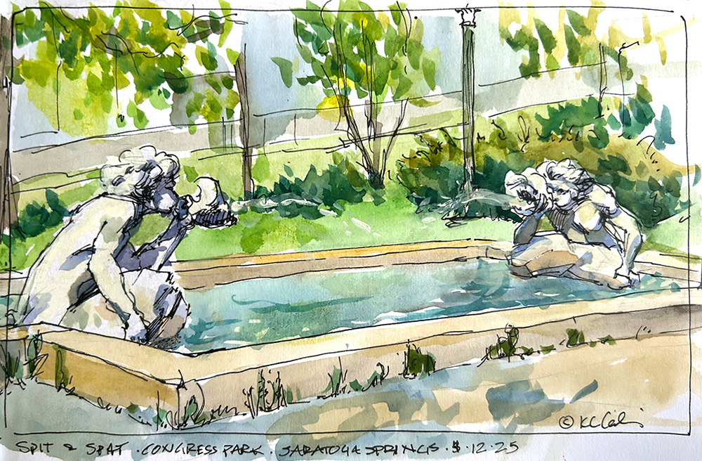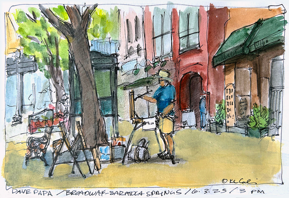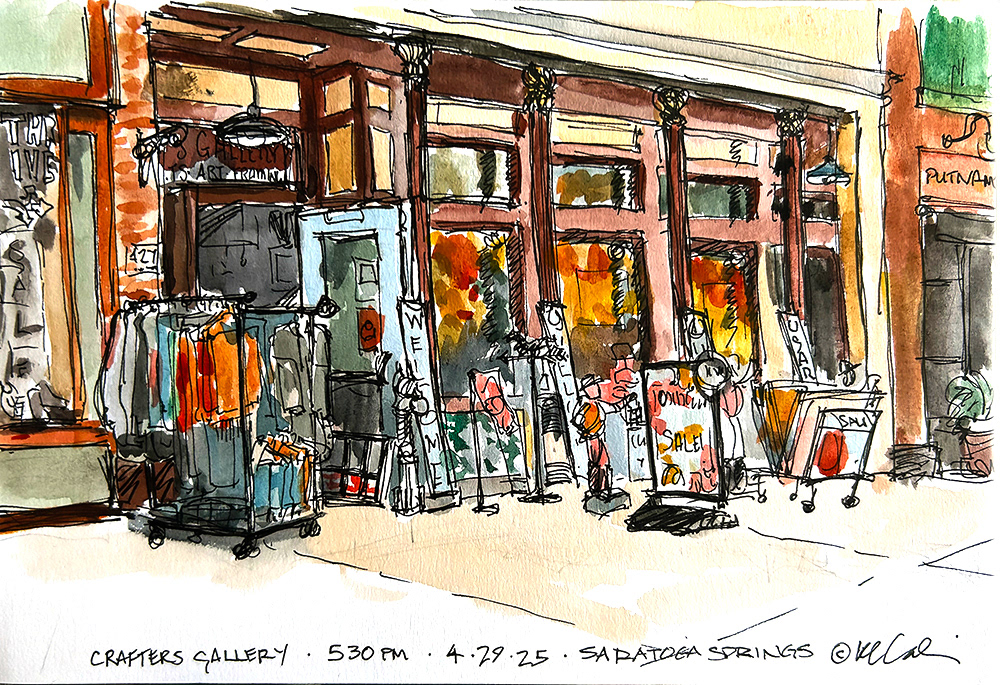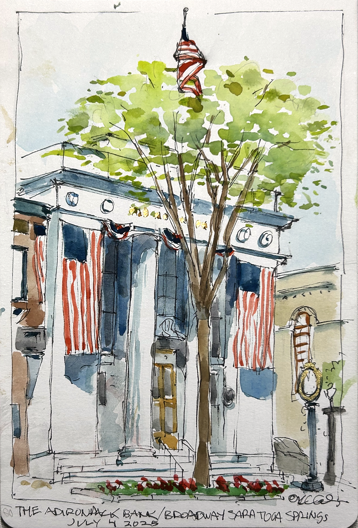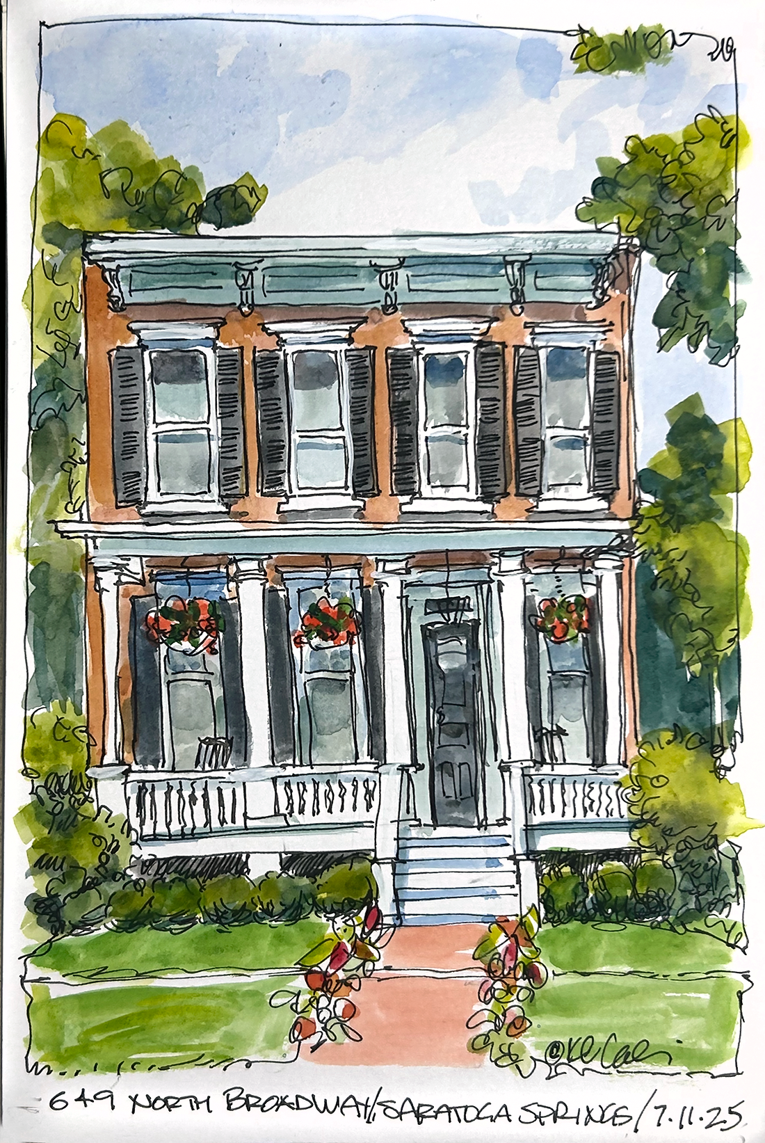 I sketch pretty much wherever I am and I also go out (usually walking) to find a place to sketch. Everything is done in an 8.5" x 5.5" Canson Graduate multimedia sketchbook with a Pentel Finito pen and a small box of watercolors.