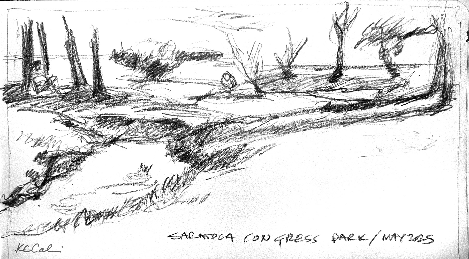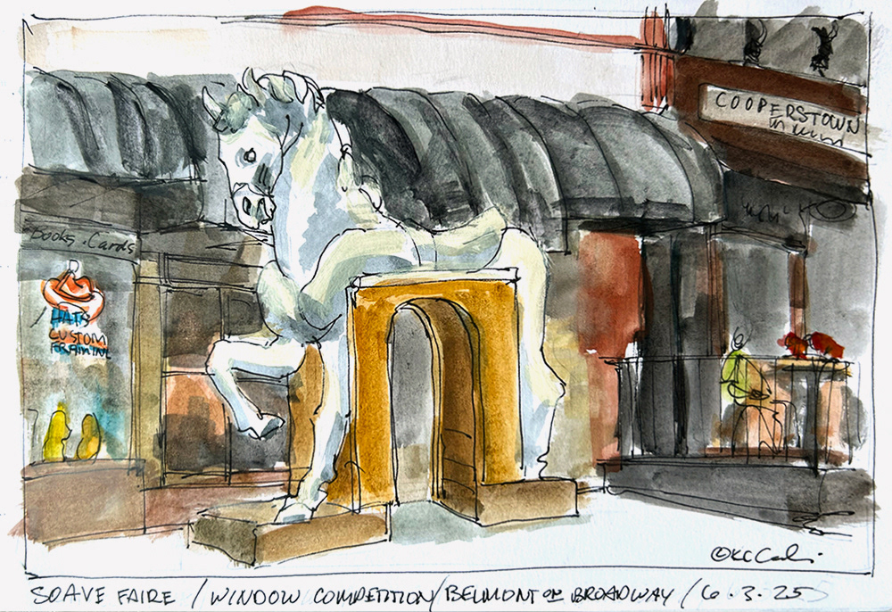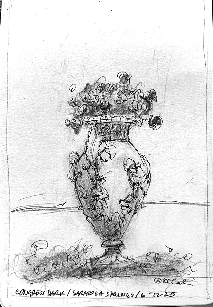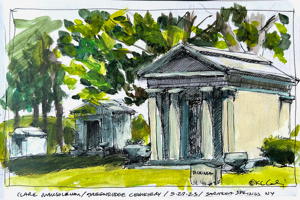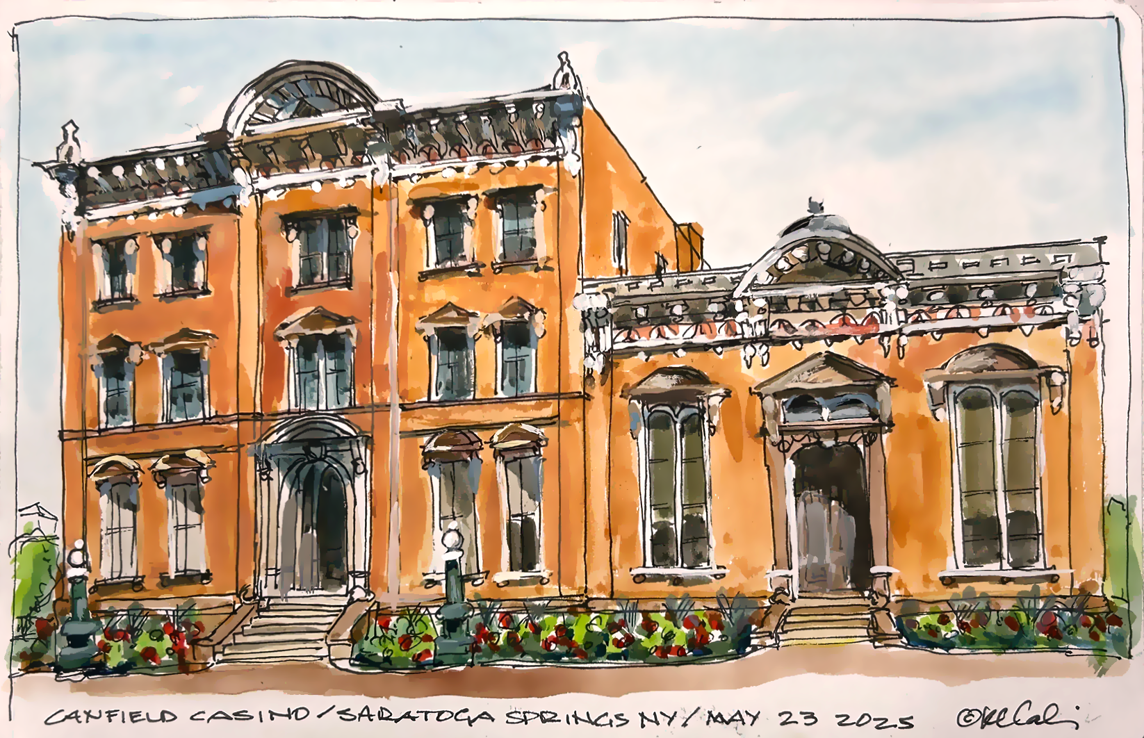I sketch pretty much wherever I am and I also go out (usually walking) to find a place to sketch. Everything is done in an 8.5" x 5.5" Canson Graduate multimedia sketchbook with a Pentel Finito pen and a small box of watercolors.